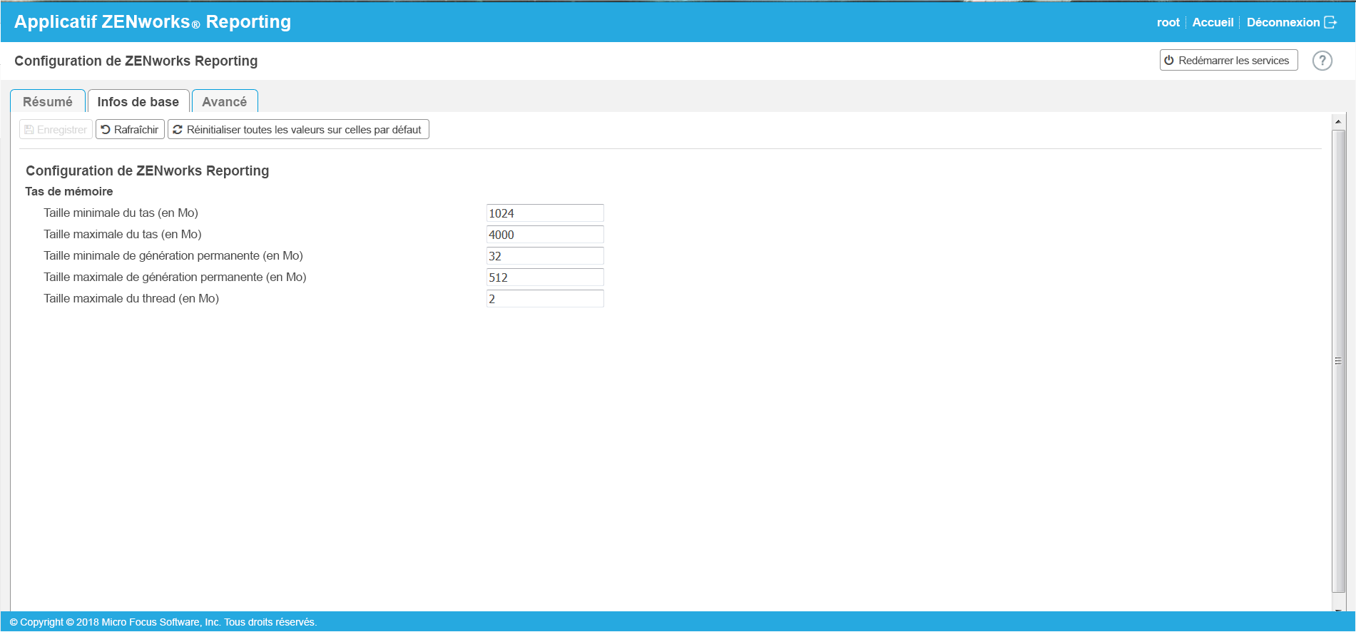 La vue Infos de base affiche les paramètres de configuration du serveur fréquemment utilisés en tant que valeurs de configuration individuelles. Vous pouvez modifier les paramètres fréquemment utilisés associés à ZENworks Reporting tels que les tailles minimale et maximale du segment de mémoire, les tailles minimale et maximale de la génération permanente ainsi que la taille de la pile de threads.