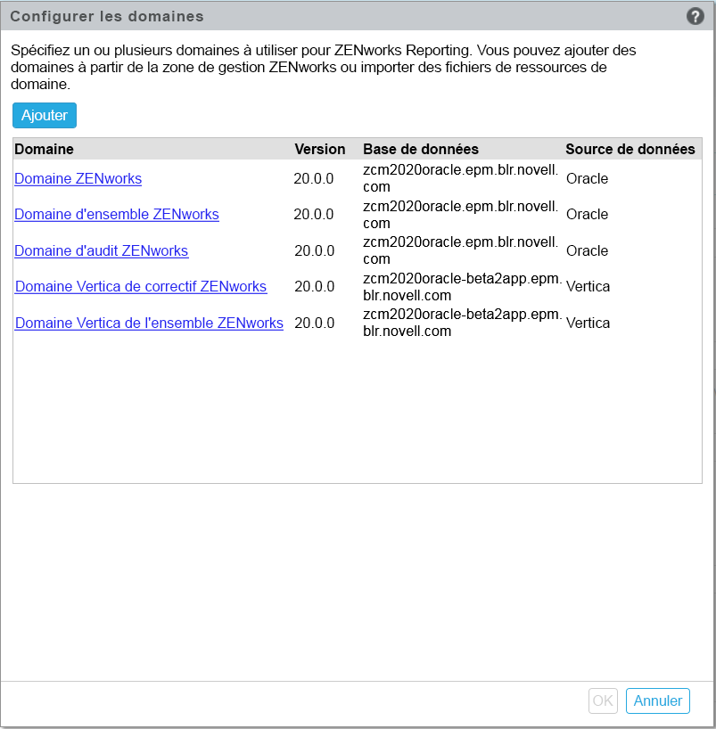 Spécifiez un ou plusieurs domaines que vous souhaitez utiliser pour ZENworks Reporting. Vous pouvez ajouter des domaines à partir de la zone de gestion ZENworks ou importer des fichiers de ressources de domaine.