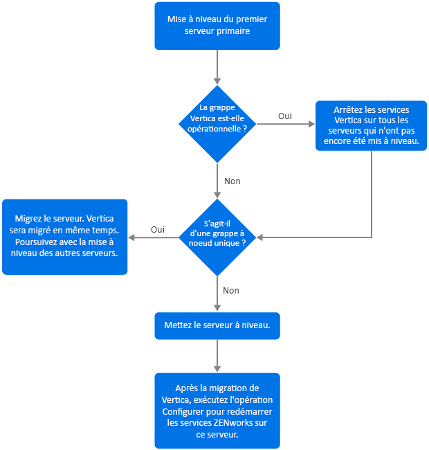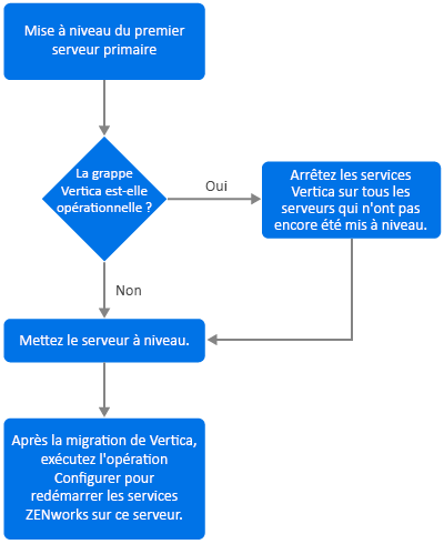 Après la mise à niveau, la zone fonctionne avec des capacités limitées jusqu'à ce que tous les serveurs sur lesquels Vertica est activé soient mis à niveau. Une fois que tous les serveurs sur lesquels Vertica est activé ont été mis à niveau, exécutez l'opération de configuration microfocus-zenworks-configure -c Start pour redémarrer les services ZENworks sur le premier serveur primaire mis à niveau.