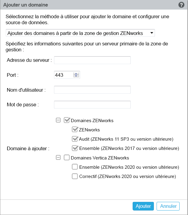 Sélectionnez Ajouter des domaines à partir de la Zone de gestion ZENworks, puis spécifiez les options suivantes :