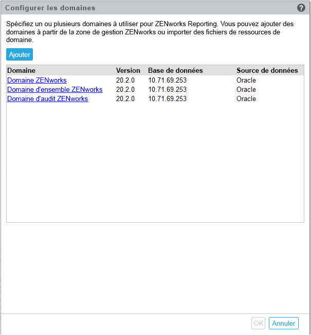 Spécifiez un ou plusieurs domaines que vous souhaitez utiliser pour ZENworks Reporting. Vous pouvez ajouter des domaines à partir de la zone de gestion ZENworks ou importer des fichiers de ressources de domaine.