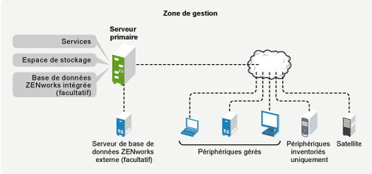Une zone de gestion se compose d'au moins un serveur primaire, de satellites (si nécessaire) et d'un ou de plusieurs périphériques gérés ou inventoriés seulement. Les serveurs primaires et les satellites collaborent pour gérer les périphériques. Les informations de la zone sont stockées dans une base de données qui réside sur l'un des serveurs primaires ou de façon externe sur un autre serveur sur lequel ZENworks n'est pas installé.