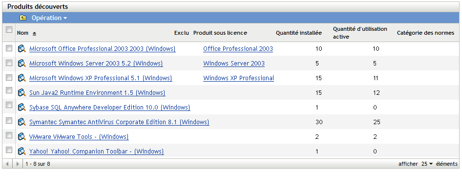 La liste des produits découverts fournit les informations d'installation relatives aux produits. Pour fournir des informations concernant les achats de produits, vous pouvez créer des produits de catalogue et des enregistrements d'achats.
