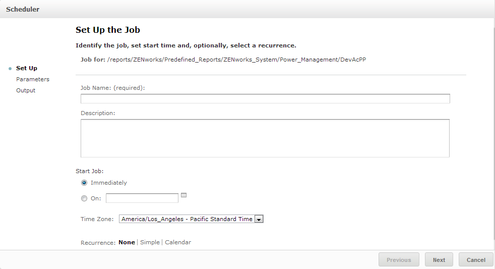 Pour exécuter des rapports automatiquement et régulièrement, sélectionnez les options de périodicité Simple ou Calendar (Agenda) sur la page Set Up the Job (Configurer le travail) :