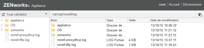 Tous les fichiers journaux surveillés sur ZENworks Appliance sont organisés en arborescence virtuelle et le chemin d'accès au fichier ou au dossier particulier est affiché. Les fichiers journaux peuvent être affichés en mode de suivi ou en mode Afficher depuis le début.