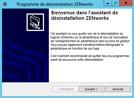 Cliquez sur Suivant, puis suivez les invites pour désinstaller le logiciel ZENworks. Si vous avez des questions sur l'une des options de désinstallation, consultez les informations du tableau ci-dessous :