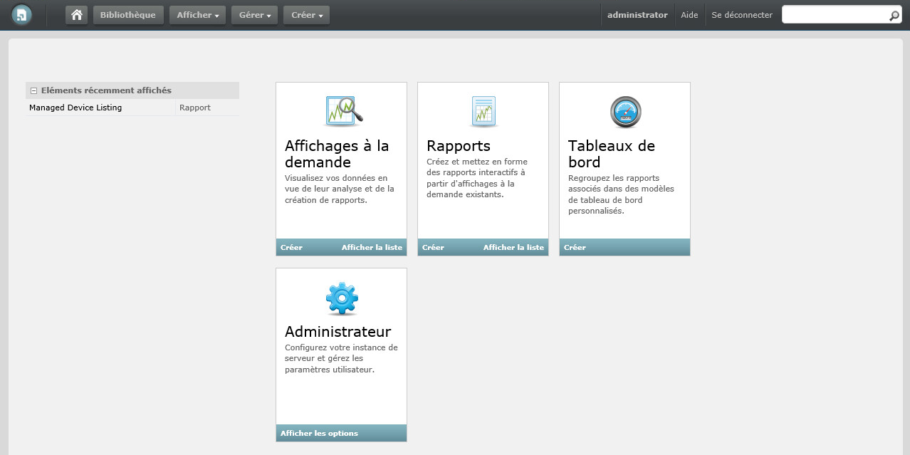 Cette page d'accueil vous permet d'accéder rapidement aux fonctionnalités les plus utilisées du serveur. Les menus sont affichés en fonction des autorisations de l'utilisateur.