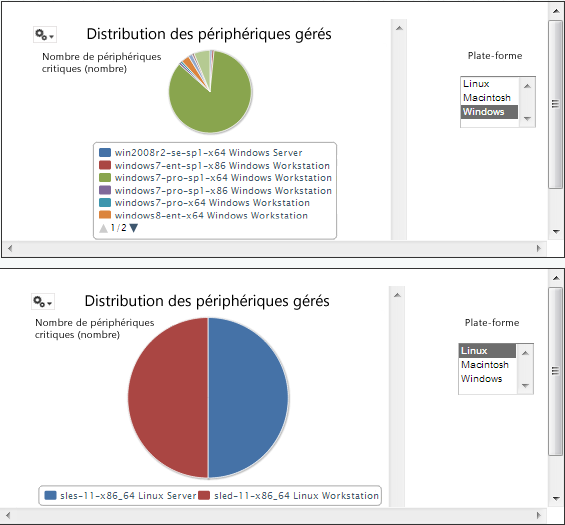 Dans l'illustration ci-dessous, le même tableau de bord est utilisé avec deux contrôles d'entrée différents : un sur la plate-forme Windows et un autre sur la plate-forme Linux. Dans cet exemple, le nombre d'appareils qui utilisent des versions différentes des systèmes d'exploitation Windows et Linux est affiché.