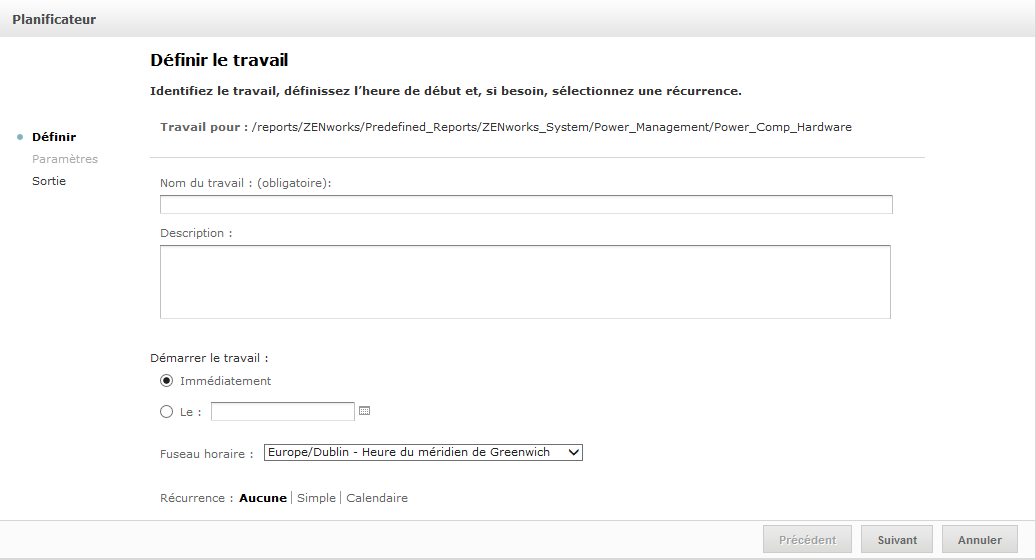 Attribuez un nom au travail dans le champ Job Name (Nom du travail) ; Rapport hebdomadaire, par exemple. La description est facultative.