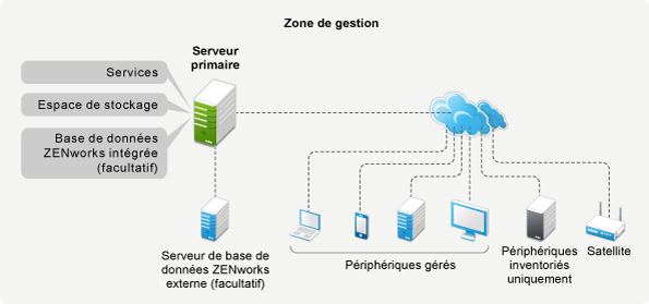 Tous les produits ZENworks utilisent la même architecture système. Cette architecture est constituée de composants tels que des serveurs primaires, des serveurs satellites et des périphériques gérés. Les composants sont organisés en domaines de gestion, appelés zones de gestion.