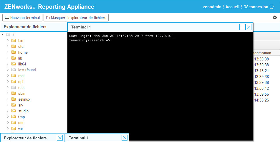 </theme>Dans la page d'accueil de l'applicatif ZENworks Reporting, sous ZENworks Reporting, cliquez sur Terminal et explorateur de fichiers.