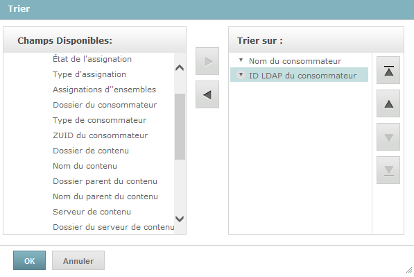 Sélectionnez chaque champ dans le panneau Sort (Trier), puis cliquez sur Move to top (Placer en début de liste), Move up (Vers le haut), Move down (Vers le bas) ou Move to bottom (Placer en fin de liste).