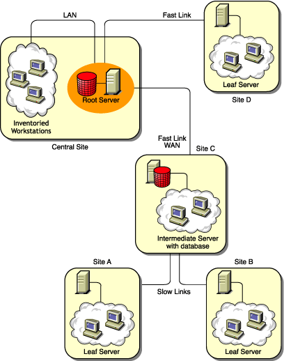 Dans ce scénario, le réseau se compose de plusieurs sites distants connectés à un site central sur un WAN. Chaque site distant possède un serveur feuille qui collecte les informations d'inventaire sur les postes de travail situés sur le même site, puis les transfère en amont vers le serveur racine qui se situe sur le site central. Les sites distants sont administrés depuis le site central car les serveurs feuille ne sont attachés à aucune base de données.