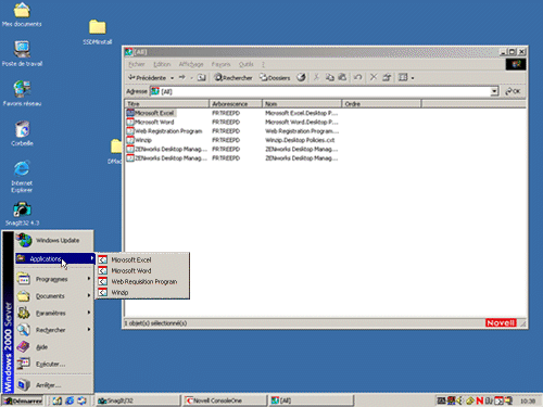 Dans l'exemple d'écran ci-après, la fenêtre Explorateur d'applications affiche les applications contenues dans DOC_TREE. Ces quatre applications sont également affichées dans le menu Démarrer et deux d'entre elles apparaissent aussi sur le bureau, l'une dans la barre Lancement rapide, l'autre dans la barre système.