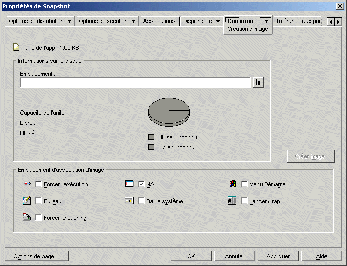 La page de propriétés Création d'image est accessible uniquement sur les objets Application créés pour les applications simples, les applications AOT/AXT et les applications MSI. Elle n'est pas accessible sur les objets Application conçus pour les applications Web et Terminal Server.