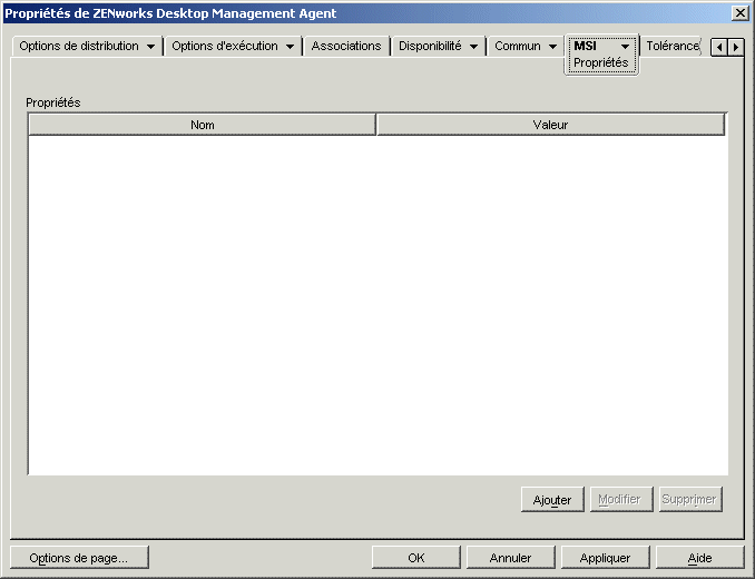 Cette page de propriétés, illustrée ci-dessous, permet de remplacer les valeurs de propriété publique contenues dans le progiciel MSI et d'ajouter de nouvelles propriétés publiques.