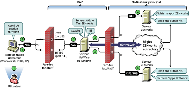 Le serveur Middle Tier ZENworks reconvertit le paquet NCP ou CIFS renvoyé au format XML, puis envoie le paquet XML à l'agent ZENworks Management par HTTP ou HTTPS. |