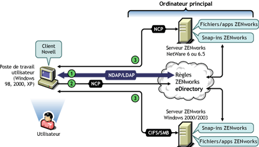 Une fois les utilisateurs authentifiés, ZENworks Desktop Management peut accéder aux fichiers de stratégie et d'application que vous avez définis pour que les postes de travail de ces utilisateurs puissent être configurés, gérés à distance ou inventoriés, et que leurs bureaux reçoivent les applications logicielles appropriées.