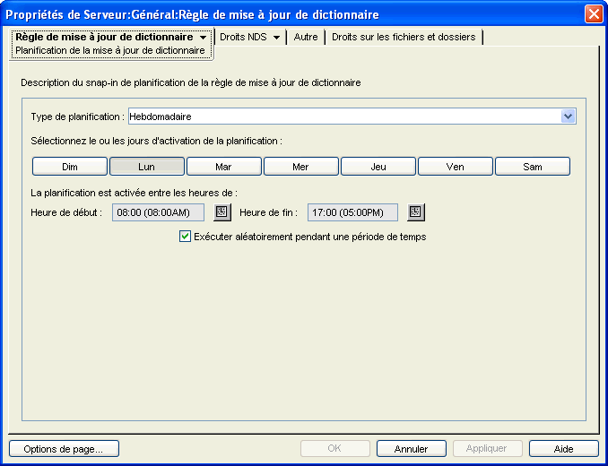 Options de page : Cliquez sur cette option pour indiquer vos préférences en ce qui concerne la disposition des pages de propriétés pour ce type d'objet. Ces préférences sont enregistrées et seront utilisées la prochaine fois que vous démarrerez Novell® ConsoleOne® sur cet ordinateur.