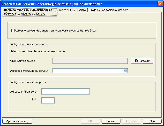 Configuration du serveur proxy : Si le serveur d'inventaire qui fournit les mises à jour de dictionnaire utilise un pare-feu, indiquez le numéro de port de l'adresse IP du serveur proxy.