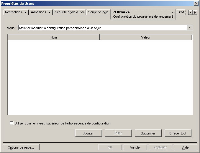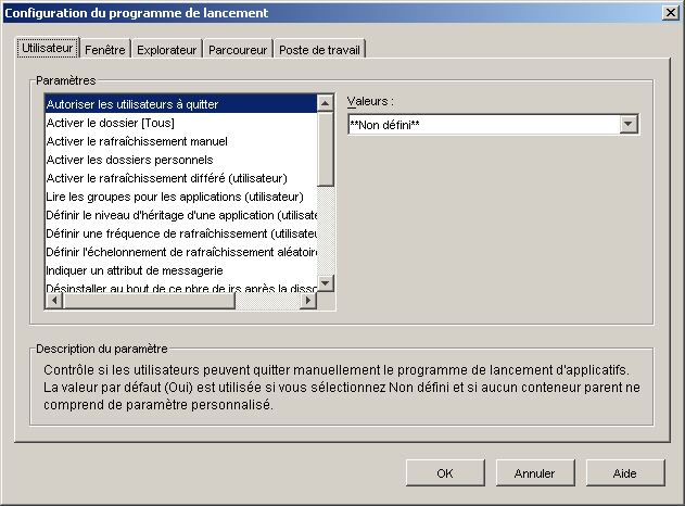 Selon le type d'objet que vous configurez, l'onglet Utilisateur ou l'onglet Poste de travail peut être indisponible. L'onglet Utilisateur n'est pas affiché sur les objets Poste de travail et Groupe de postes de travail, et l'onglet Poste de travail n'est pas affiché sur les objets Utilisateur et Groupe d'utilisateurs.