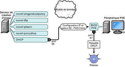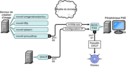 Au démarrage du périphérique, le BIOS PXE émet une requête DHCP avec des extensions PXE. La requête est diffusée sur le port 67.