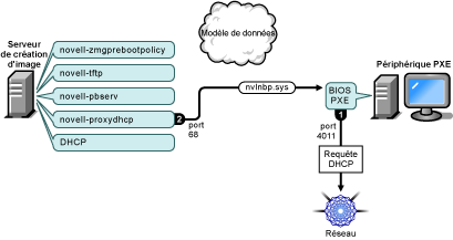 Le daemon novell-proxydhcp répond en indiquant les adresses IP du serveur TFTP et le nom de fichier du programme d'amorçage des services de pré-lancement (nvlnbp.sys).