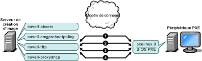 Selon que novell-proxydhcp est configuré sur le même serveur en tant que serveur DHCP standard ou sur un autre serveur, le processus de création d'image débute différemment. Les sections suivantes illustrent le début du processus pour chaque configuration. Les phases décrites à la Phases 2 à 8 : Poursuite du processus sont ensuite identiques.