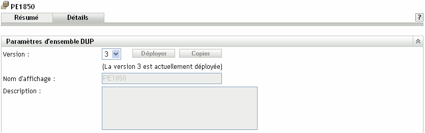 Il n'est possible de déployer qu'une version d'un ensemble à un moment donné. Par exemple, supposons qu'un ensemble ait plusieurs versions : 1, 2 et 3 Si la version 2 est actuellement déployée, cette version de l'ensemble est déployée sur tous les périphériques associés. Si vous recevez une mise à jour de ce paquetage par mise en miroir, un lien de la page > du Centre de contrôle ZENworks indique qu'une mise à jour est disponible (comme décrit à la Section 23.3, Détermination de la disponibilité de nouveaux paquetages de mise à jour Dell pour les serveurs PowerEdge). Pour mettre à jour l'ensemble sur les périphériques, vous devez changer la version déployée pour la version 3 ; tous les périphériques sur lesquels la version 2 est déployée et qui sont encore associés à cet ensemble sont automatiquement mis à niveau vers la version 3.