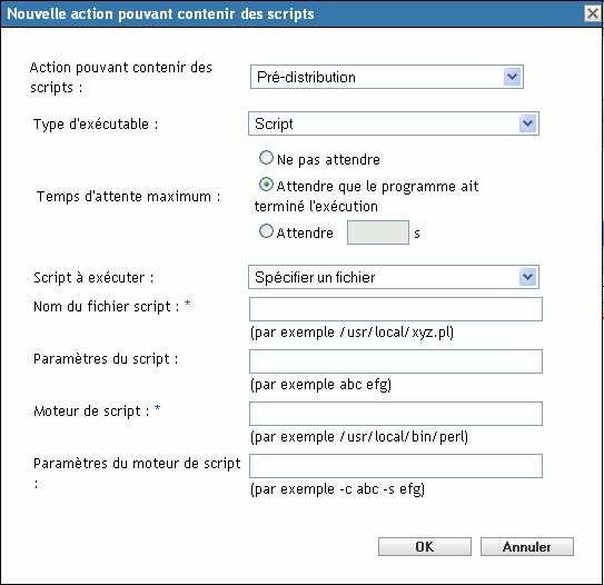 Dans le processus de distribution d'un ensemble, ZENworks Linux Management peut lancer des opérations scriptables qui seront exécutées avant ou après la distribution, l'installation ou la désinstallation de l'ensemble. Par exemple, vous pouvez récupérer des fichiers de données d'un serveur Web avant d'installer une application qui les utilise, exécuter des applications, etc.