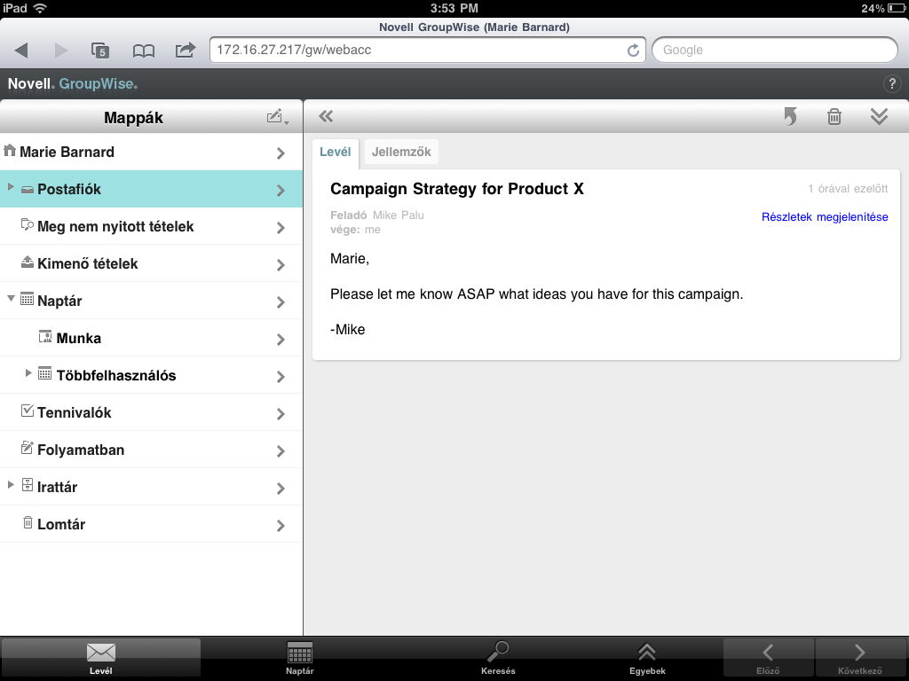 Amikor a GroupWise rendszerbe a táblagép webböngészőjén keresztül jelentkezik be, a postafiók jelenik meg.