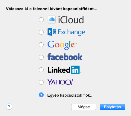 A Mac Kapcsolatok alkalmazásban válassza a Kapcsolatok > Fiók hozzáadása lehetőséget.