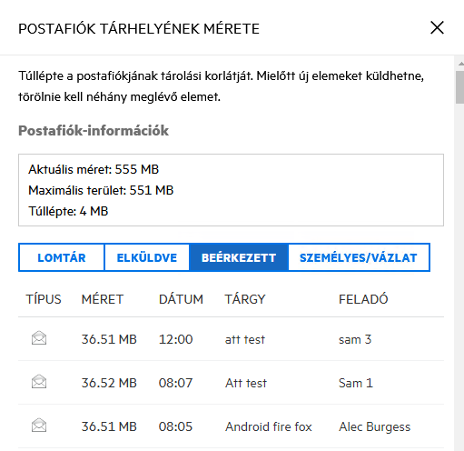 Ha a postafiókhoz korlátozás van beállítva (vagy akkor is, ha nincs korlátozás), közvetlenül a Postafiók-tárolóméret menüpontból elvégezhet néhány műveletet a postafiók méretének csökkentéséhez. Az információkat négy elemtípusgomb jeleníti meg: Lomtár, Elküldött, Beérkezett és Személyes/vázlat.