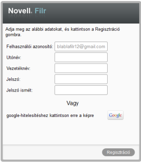 Ha a felhasználó Google-ös (@gmail.com) vagy Yahoo-s (@yahoo.com) e-mail címmel rendelkezik, a Filr-portálra Google- vagy Yahoo-fiókjával is be tud jelentkezni, de regisztrálhatja is magát a Filr-portálon.