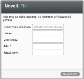 Más (például céges) e-mail címek esetén a felhasználónak regisztrálnia kell magát a Filr-portálon a bejelentkezéshez.