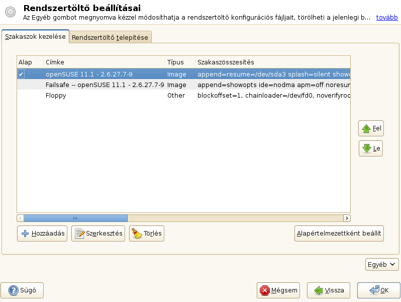 A rendszertölto beállításának legegyszerubb módjaz openSUSE rendszeren a YaST megfelelo moduljának a használata. A YaST vezérloközpontban válassza ki a menüpontot. Megjelennek a rendszer aktuális rendszertölto-beállításai és itt végezhetok el a kívánt módosítások. Lásd: Ábra 15-1