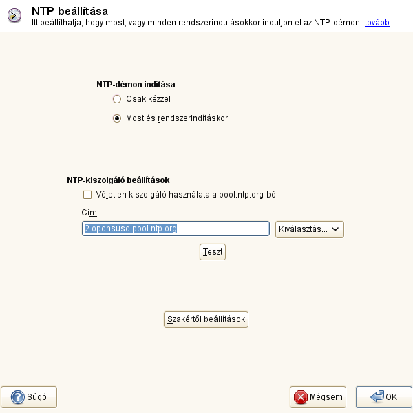 Az NTP-kliens gyors beállítása () mindössze két párbeszédablakból áll. Az elso párbeszédablakban állíthatja be az xntpd indítási módját és a lekérdezendo kiszolgálót. Ahhoz, hogy az xntpd a rendszerindításkor automatikusan elinduljon, kattintson a menüpontra. Majd adja meg az értékeit. A 0.opensuse.pool.ntp.org, 1.opensuse.pool.ntp.org, 2.opensuse.pool.ntp.org vagy 3.opensuse.pool.ntp.org elore ki van jelölve. Kattintson a pontra, ha nem akar elore megadott idokiszolgálót használni. Alternatív megoldásként kattintson a gombra egy második párbeszédablak megjelenítéséhez, amelyben kiválaszthatja a hálózatnak legmegfelelobb idokiszolgálót.
