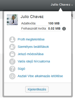 Saját neve: A Vibe minden oldalának jobb felső sarkában megjelenik hivatkozásként a saját neve. Erre kattintva az alábbi lehetőségeket érheti el: