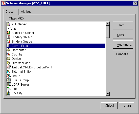 Per estendere lo schema dell'albero eDirectory, è necessario disporre del diritto Supervisore sull'intero albero. Per visualizzare lo schema attuale, fare clic in un punto qualsiasi dell'albero, quindi scegliere Strumenti > Manager dello schema. Viene visualizzato l'elenco delle classi e delle proprietà disponibili, come illustrato di seguito. Fare doppio clic su una classe o su una proprietà per visualizzare le relative informazioni.