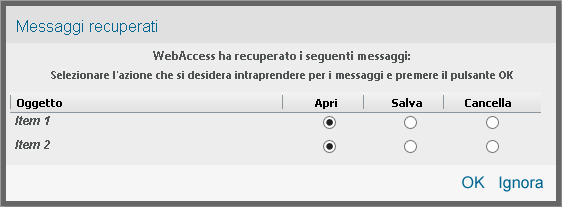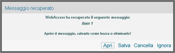Ignora: mantiene i messaggi salvati su disco, ma non li ripristina in WebAccess. Al successivo avvio di WebAccess, la finestra di salvataggio automatico viene visualizzata di nuovo.