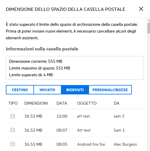 È possibile verificare periodicamente la dimensione o la quantità di spazio delle caselle postali e gestire lo spazio in autonomia. In altri casi sono configurate limitazioni che impediscono l'esecuzione di azioni specifiche finché non si riducono le dimensioni della casella postale.