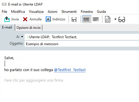 La funzione Menzioni consente di utilizzare il completamento del nome della Rubrica nel corpo degli Elementi inviati sia per aggiungere rapidamente i destinatari al campo A sia per richiamare l'attenzione su tali destinatari direttamente nel testo del messaggio mediante il nome collegato ed enfatizzato che viene inserito nel messaggio.