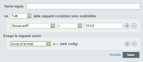 Le regole possono essere basate su qualsiasi campo evento in cui è possibile eseguire delle ricerche. Per un elenco di questi campi, vedere la Tabella 4-1. Gli operatori disponibili dipendono dal tipo di dati del campo evento. Ad esempio match subnet è disponibile per gli indirizzi IP e match regex è disponibile per i campi di testo.