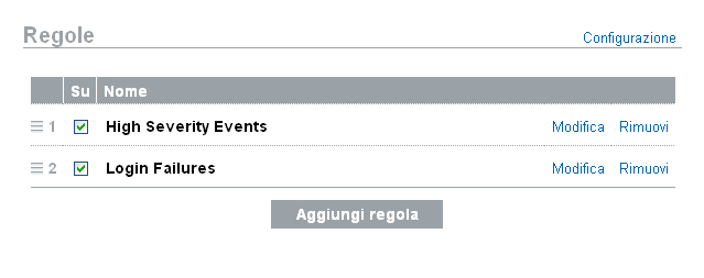 A sinistra di ciascuna regola, in una colonna intestata On, è presente una casella di controllo per attivare tale regola. Le nuove regole sono attivate per default. Se si disattiva una regola, gli eventi in entrata non verranno più valutati in base a quella regola. Se nella coda sono presenti eventi associati a una o più azioni, è possibile che lo svuotamento della coda successivo alla disattivazione della regola richieda del tempo.