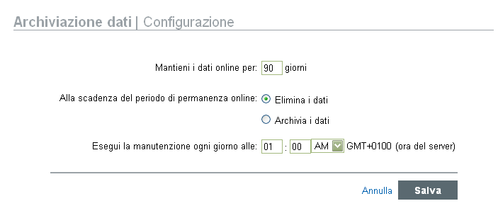 After online period expires: alla scadenza del periodo di conservazione online tutti i dati degli eventi più vecchi del periodo di tempo indicato vengono eliminati o spostati all'esterno del database in una directory di archiviazione.