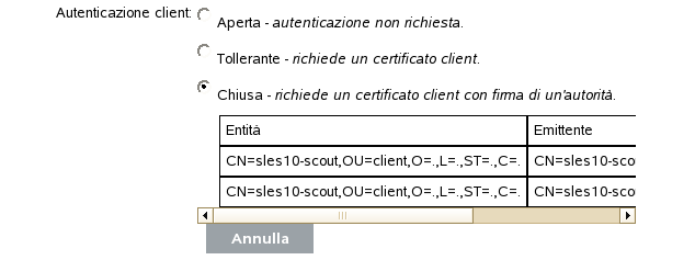 Configurare le impostazioni dell'autenticazione del client e delle coppie di chiavi del server appropriate. Per ulteriori informazioni, vedere la Sezione 6.3.2, Autenticazione client.