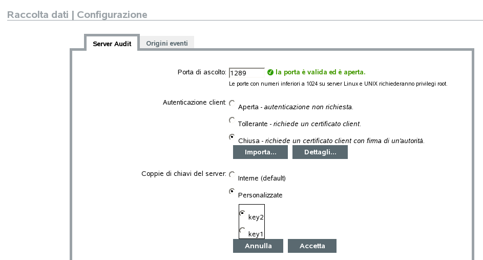 Gli amministratori possono modificare alcune impostazioni relative al modo in cui Identity Audit rimane in attesa di dati provenienti dalle applicazioni di origine degli eventi, inclusa la porta su cui Identity Audit è in attesa e il tipo di autenticazione fra l'origine dell'evento e Identity Audit.