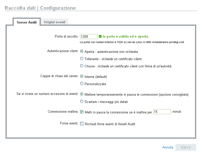 L'associazione a porte inferiori alla 1024 richiede privilegi da utente root. Al contrario Novell consiglia di utilizzare una porta superiore alla 1024. È possibile modificare i dispositivi di origine per l'invio a una porta superiore o l'utilizzo dell'inoltro della porta nel server di Identity Audit.