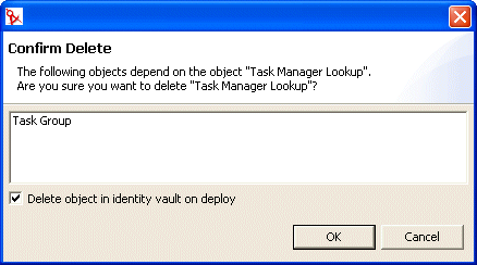 Se si tenta di eliminare un oggetto nella visualizzazione provisioning o nell'editor dello strato di astrazione directory, verrà visualizzata una finestra di dialogo simile alla seguente in cui viene richiesto di confermare l'eliminazione.