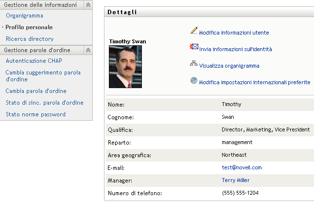 Nello scenario seguente viene illustrato come un utente può utilizzare i collegamenti ai dettagli di un altro utente o gruppo. Timothy Swan, vicepresidente del reparto marketing, esegue il login all'applicazione utente di Identity Manager e passa alla pagina Profilo personale: